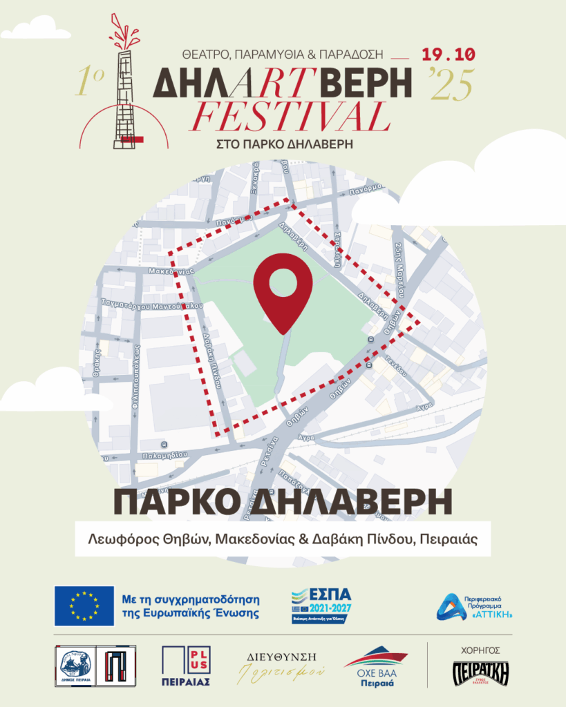 Το φεστιβάλ ΔΗΛΑRTΒΕΡΗ, μια γιορτή πολιτισμού, έρχεται για πρώτη φορά την Κυριακή 19 Οκτωβρίου 2025 στο πάρκο Δηλαβέρη (Δαβάκη Πίνδου 17) στον Πειραιά, με ελεύθερη είσοδο για μικρούς και μεγάλους, εντάσσοντας το πάρκο στον πολιτιστικό χάρτη της πόλης.