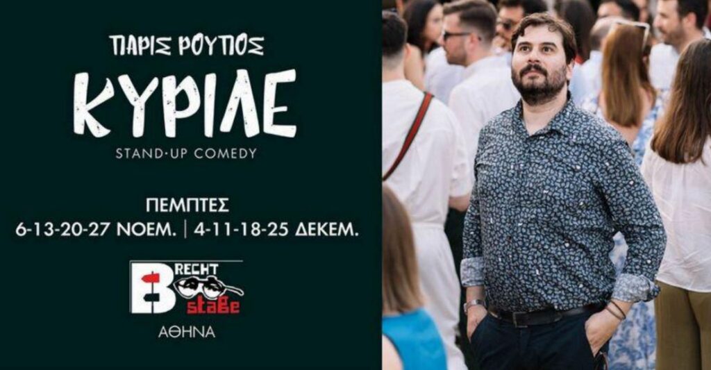 Μετά τα “Δουλίτσα Να Υπάρχει” και “Όχι Μανάδες” που δίκασαν κοινό και κριτικούς, το κακό τριτώνει και ο Πάρις Ρούπος επανέρχεται με το 3ο του σόλο show, “ΚΥΡΙΛΕ”. Σε αυτό, εκτός των άλλων, αναρωτιέται ποιοι οδηγούνε smart, γιατί δεν έχει καλό ίντερνετ στους αρχαιολογικούς χώρους, από πού προέρχονται τα hate comments στα social media, τι να απέγινε η ιρλανδέζικη μαφία, ποιοι είναι αυτοί οι άνθρωποι που αλλάξανε πράγματι τον κόσμο, αν είμαστε άραγε μόνοι μας στη γη και κάνει flat-shaming στους επιπεδιστές.