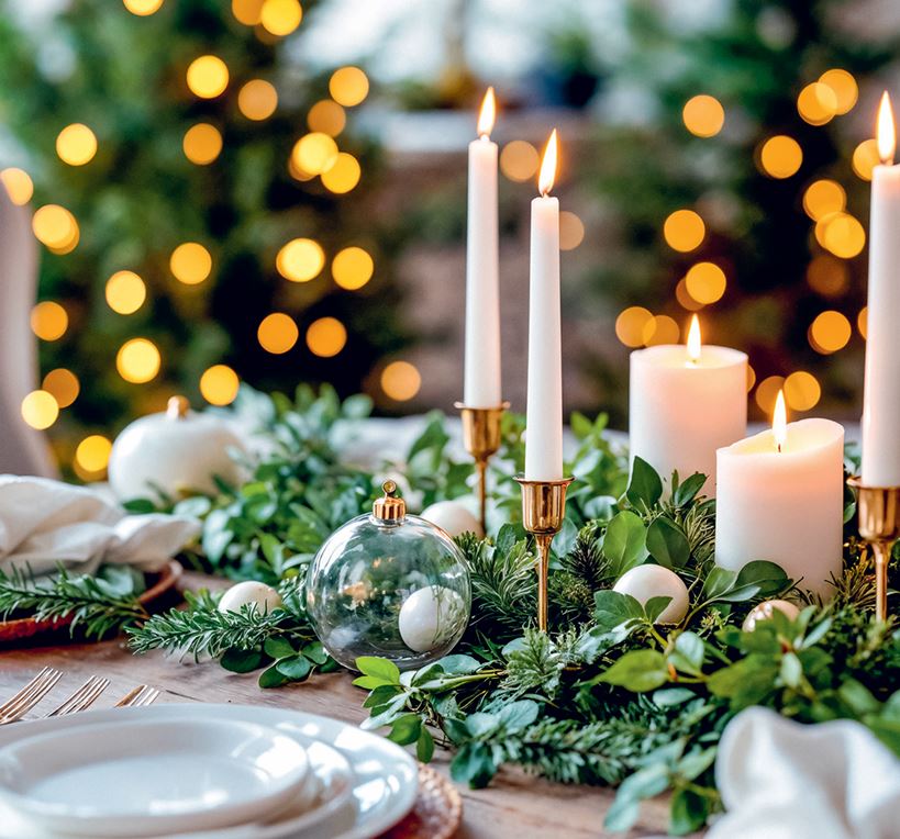 Στο centerpiece πρωταγωνιστούν τα φυσικά υλικά: έλατο, κουκουνάρια, αποξηραμένα πορτοκάλια και γκι, συνδυασμένα με χαμηλά κεριά για ατμόσφαιρα. Αποφύγετε τα ψηλά διακοσμητικά που εμποδίζουν την οπτική επαφή – το τραπέζι είναι χώρος επικοινωνίας, όχι επίδειξης.